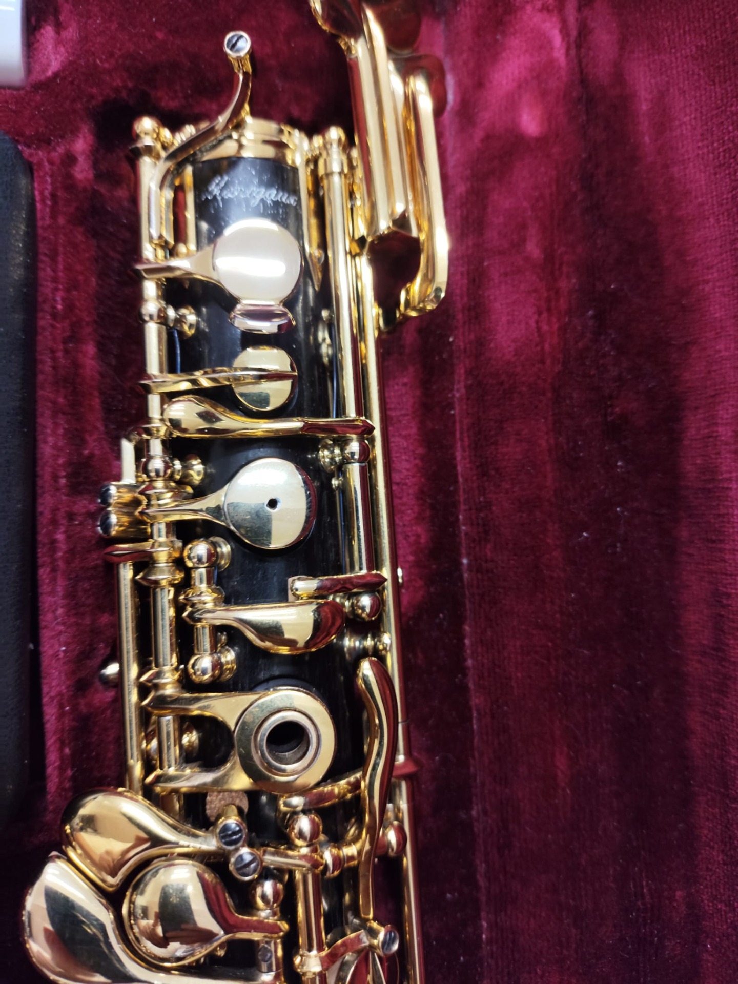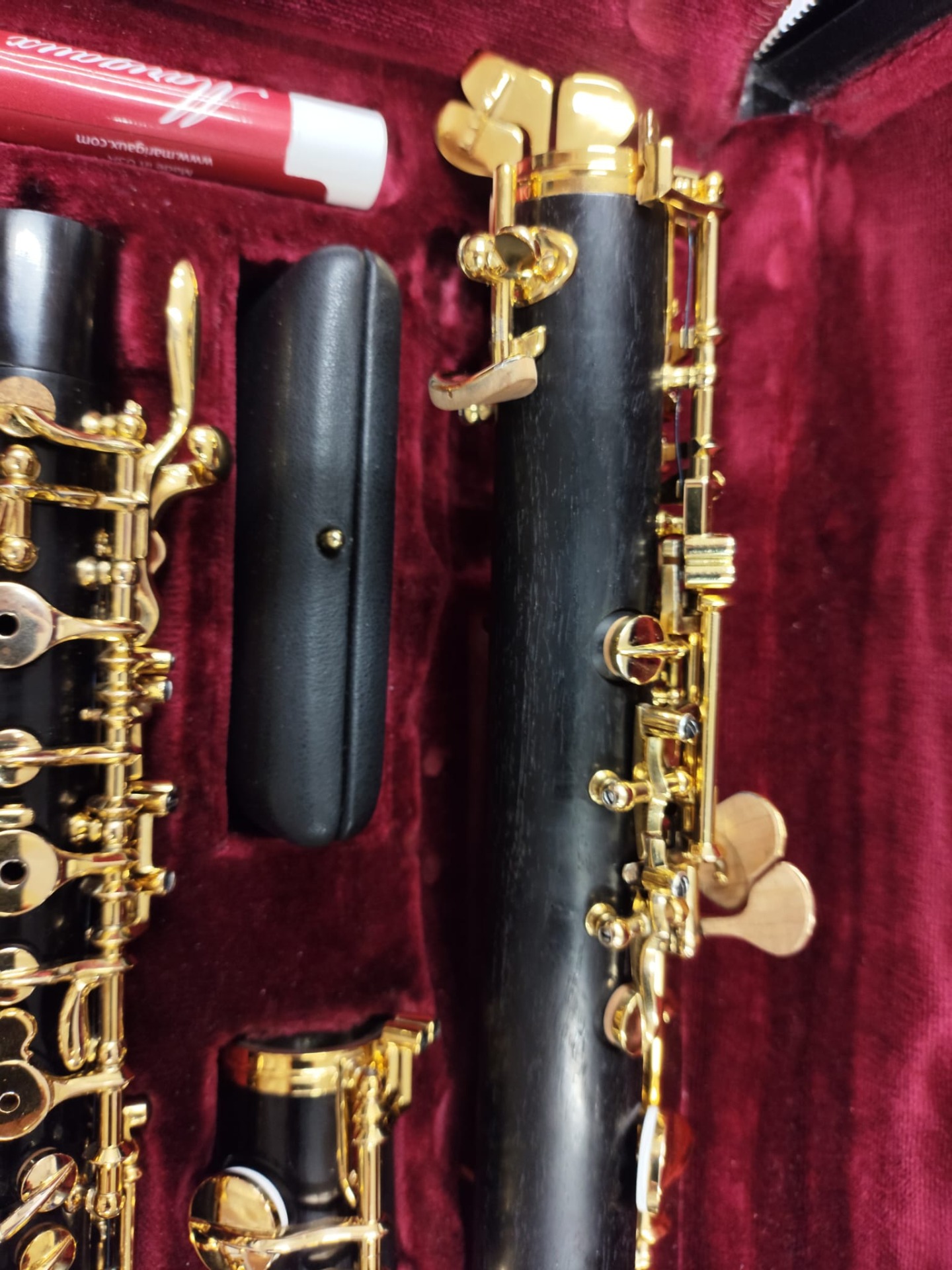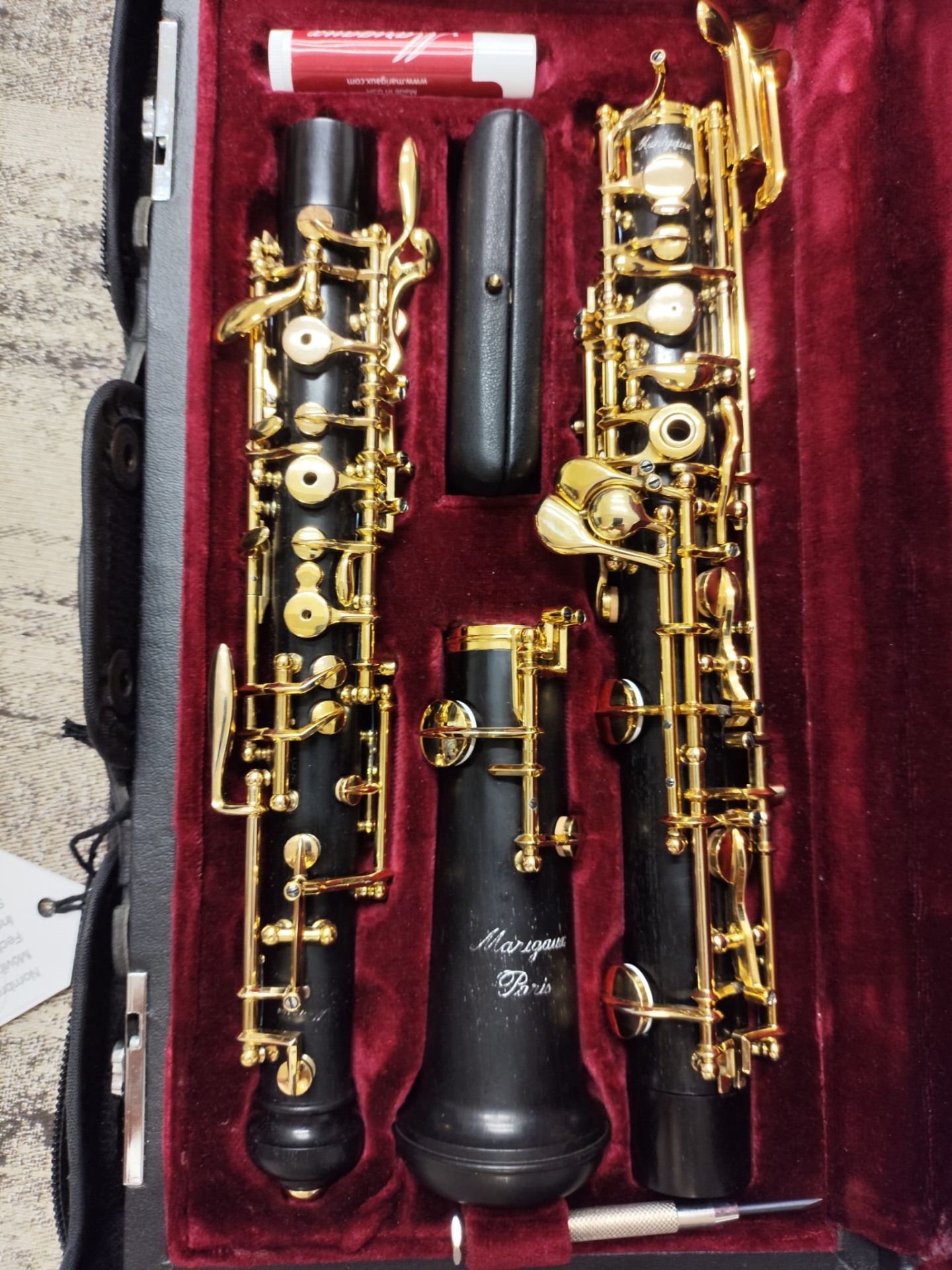 Oboe Marigaux modelo 2008, instrumento profesional fabricado en granadilla (Dalbergia melanoxylon) de alta densidad, seleccionada por su estabilidad y capacidad de proyección. Este modelo destaca por su sonoridad oscura, centrada y extremadamente homogénea, sello característico de la casa Marigaux.